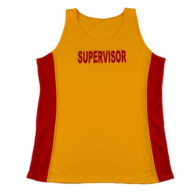 • Has SUPERVISOR lettered on the front and back in red and the Lifesaving Society round bilingual logo on the back shoulder in white.