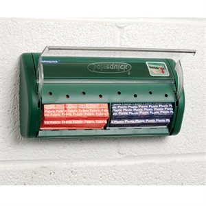 Wall-mountable Salvequick® system displays and dispenses strip bandage options individually for use.