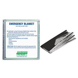 Multipurpose, emergency first aid blanket made of aluminized non-stretch polyester.